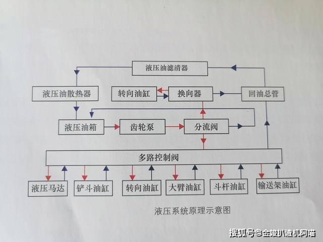液压油经过齿轮泵加压到多路转向阀,通过操纵相关手柄控制对应的阀路把液压油输送到个控制油缸,马达,而后马达完成挖掘,行走,输送等动作。当不工作是,液压油经多路阀向阀中间油道经过滤清器过滤再又散热器散热后回流至油箱内。