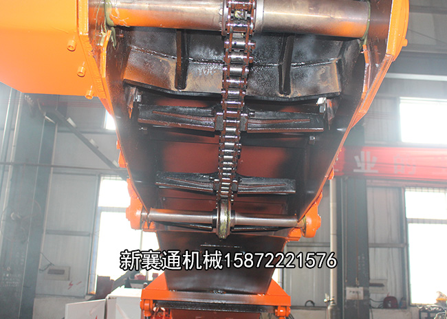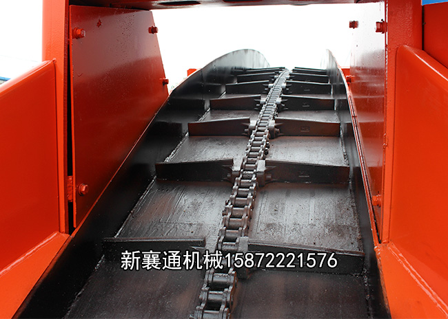 4、刮板链的调整; 调整刮板链时先松开主动轮支架上的4个固定螺栓,然后拧动调整螺母,注意两边的调整量要相等。到运输槽尾部刮板链下垂量为100毫米,将各螺栓和螺母紧固。