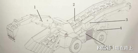 目前扒渣机行业多以ZWY系列挖掘式装载机为主,ZWY系列挖掘式装载机由底盘系统、挖掘装载系统、输送系统及液压、电气系统五大部分组成。采用外接电源或自带柴油机为动力;采用全液压驱动,将电力、液压、机械传动完美结合,通过电气和液压控制系统,操控和协调底盘、挖掘、输送系统动作,完成车辆行走、转向、制动、挖掘、输送、回转、卸料等功能。下面是ZWY系列非煤矿轮胎式矿用挖掘式装载机大体结构图: